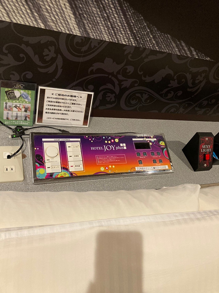 ROOM 231 D-type No.231設備 共通設備: NET-TV オーダーシステム 持込冷蔵庫 電子レンジ 電気ケトル DVDプレイヤー ハンドマッサージ機 空気清浄機 くるくるドライヤー ウォーターサーバー カラオケルーム マッサージチェアセクシーライト 露天風呂 照明スイッチ(ベッドパネル) クリックすると大きな画像がポップアップします。