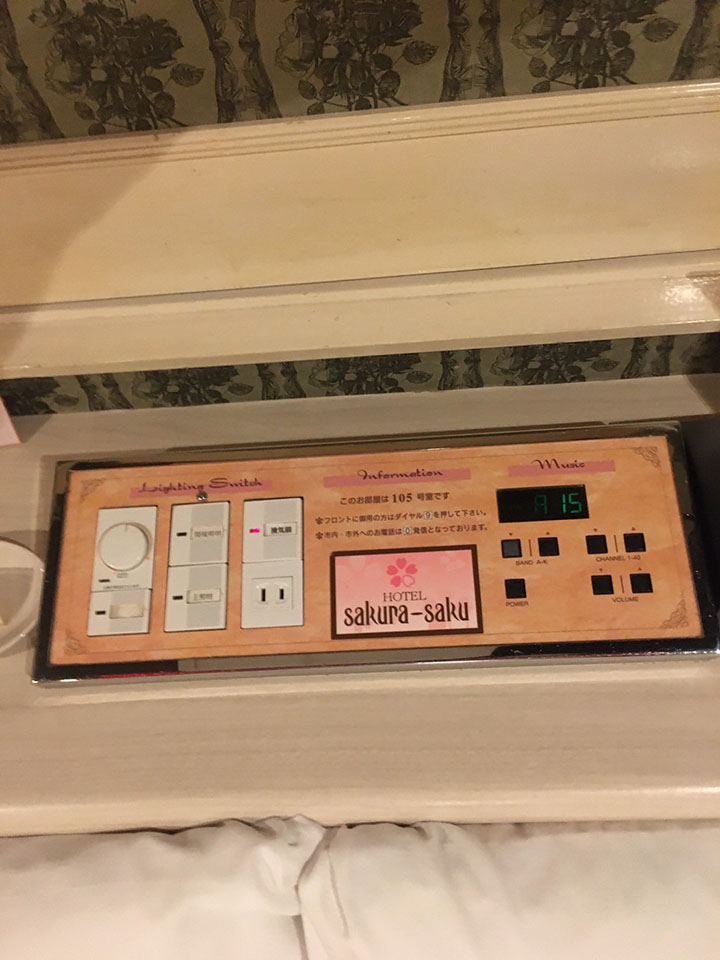 ROOM 105 B-type No.105設備 共通設備 65型NET-TV オーダーシステム カラオケ コンビニBOX システム冷蔵庫 持込冷蔵庫 電子レンジ ブルーレイプレイヤー ハンドマッサージ機 ウォーターサーバー 有線BGM 加湿器付空気清浄機 ジェットバス 照明スイッチ(ベッドパネル) クリックすると大きな画像がポップアップします。