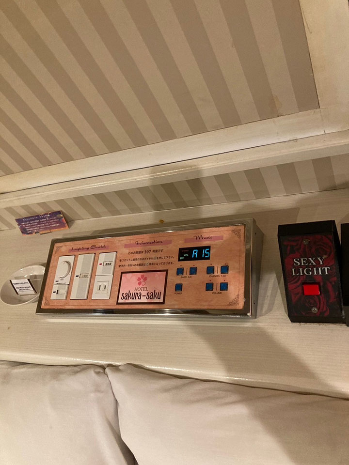 ROOM 107 A-type No.107設備 共通設備 65型NET-TV オーダーシステム カラオケ コンビニBOX システム冷蔵庫 持込冷蔵庫 電子レンジ ブルーレイプレイヤー ハンドマッサージ機 ウォーターサーバー 有線BGM 加湿器付空気清浄機 セクシーライト ジェットバス 照明スイッチ(ベッドパネル) クリックすると大きな画像がポップアップします。