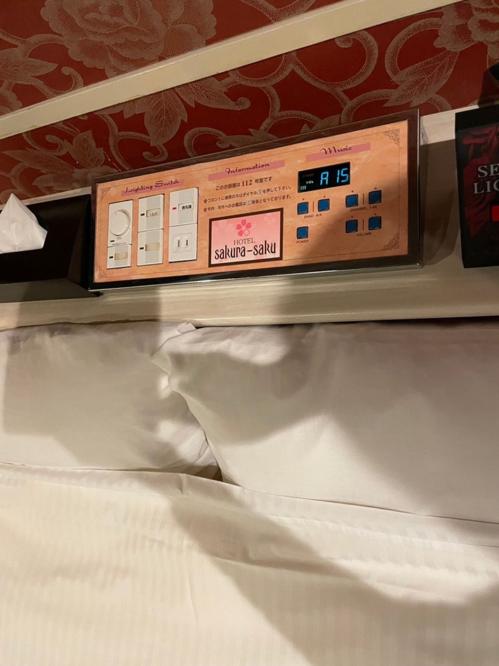 ROOM 112 B-type No.112設備 共通設備 65型NET-TV オーダーシステム カラオケ コンビニBOX システム冷蔵庫 持込冷蔵庫 電子レンジ ブルーレイプレイヤー ハンドマッサージ機 ウォーターサーバー 有線BGM 加湿器付空気清浄機 セクシーライト ブローバス スロット(番長) 照明スイッチ(ベッドパネル) クリックすると大きな画像がポップアップします。