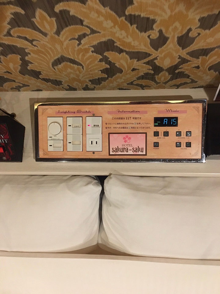 ROOM 117 A-type No.117設備 共通設備 65型NET-TV オーダーシステム カラオケ コンビニBOX システム冷蔵庫 持込冷蔵庫 電子レンジ ブルーレイプレイヤー ハンドマッサージ機 ウォーターサーバー 有線BGM 加湿器付空気清浄機 セクシーライト ブローバス スロット(バジリスク) 照明スイッチ(ベッドパネル) クリックすると大きな画像がポップアップします。