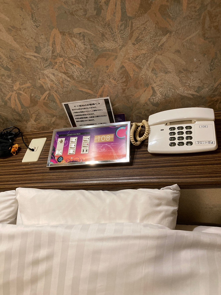 ROOM 108 B-type No.108設備 共通設備: NET-TV オーダーシステム 持込冷蔵庫 電子レンジ 電気ケトル DVDプレイヤー ハンドマッサージ機 空気清浄機 浴室テレビ レインボージェットバス 照明スイッチ(ベッドパネル) クリックすると大きな画像がポップアップします。