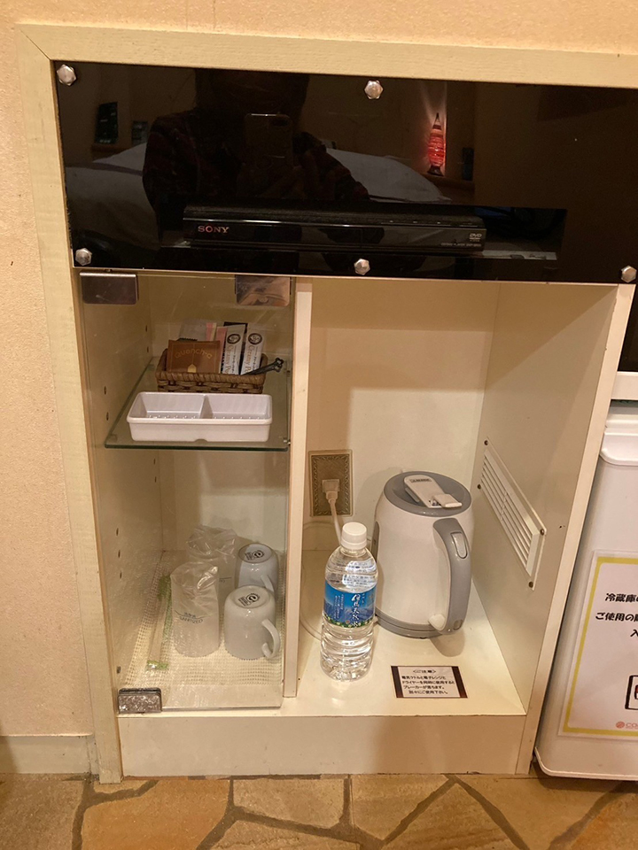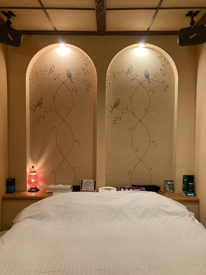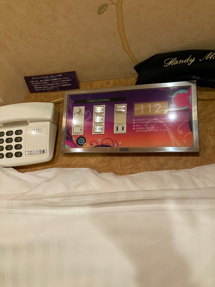 ROOM 112 A-type No.112設備 共通設備: NET-TV オーダーシステム 持込冷蔵庫 電子レンジ 電気ケトル DVDプレイヤー ハンドマッサージ機 空気清浄機 照明スイッチ(ベッドパネル) クリックすると大きな画像がポップアップします。