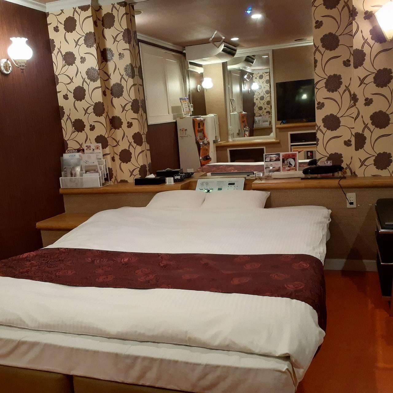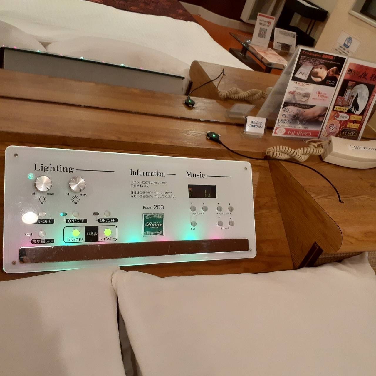 ROOM 203 B-type No.203設備 共通設備: NET-TV オーダーシステム システム冷蔵庫 電子レンジ 電気ケトル DVDプレイヤー ハンドマッサージ機 携帯充電器 空気清浄機 くるくるドライヤー コンビニBOX 持込冷蔵庫 ウォーターサーバー 特別設備: マット 鏡 レインボーライト スロット 照明スイッチ(ベッドパネル) クリックすると大きな画像がポップアップします。