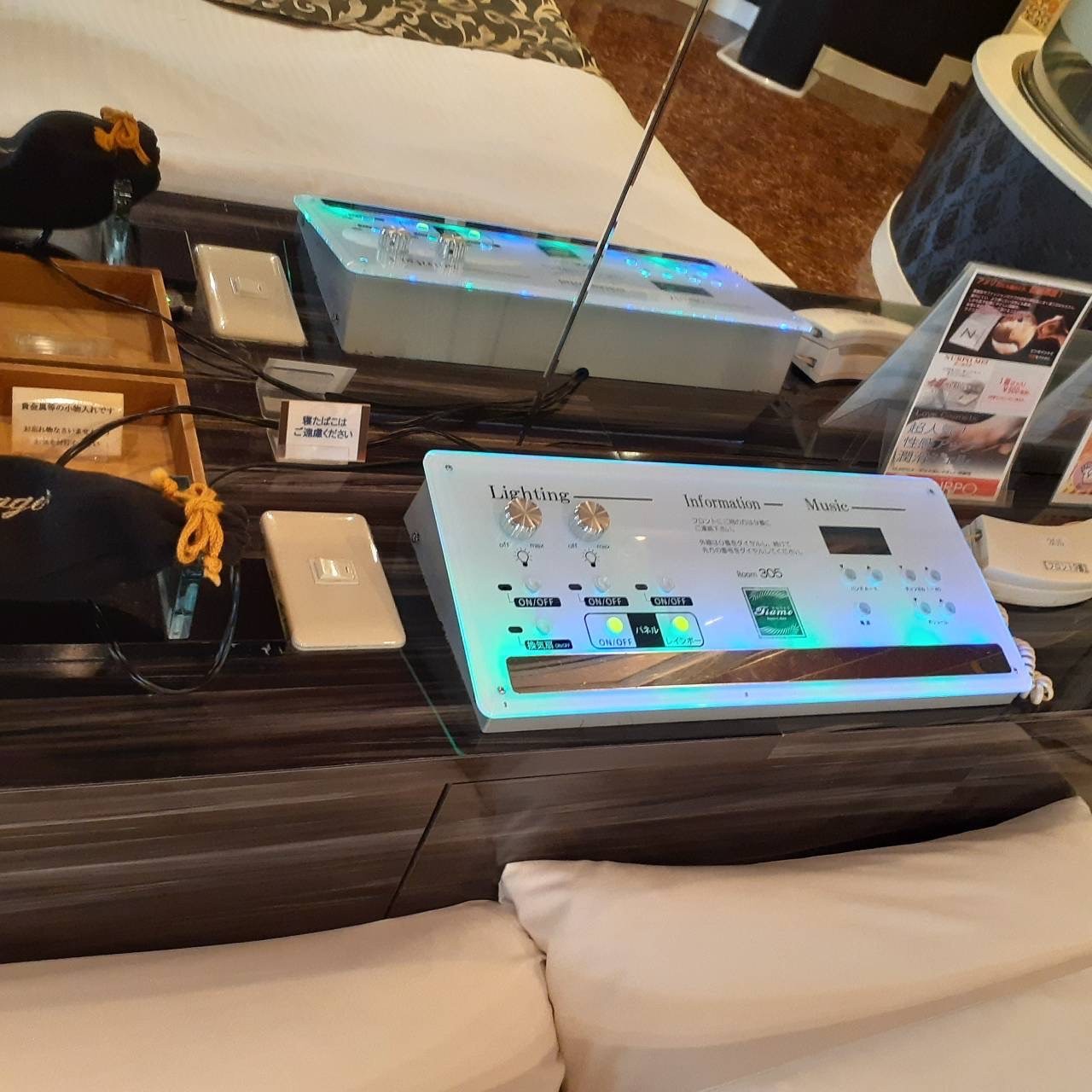 ROOM 305 B-type No.305設備 共通設備: NET-TV オーダーシステム システム冷蔵庫 電子レンジ 電気ケトル DVDプレイヤー ハンドマッサージ機 携帯充電器 空気清浄機 くるくるドライヤー コンビニBOX 持込冷蔵庫 ウォーターサーバー 特別設備: マット 鏡 ジャグジー 照明スイッチ(ベッドパネル) クリックすると大きな画像がポップアップします。